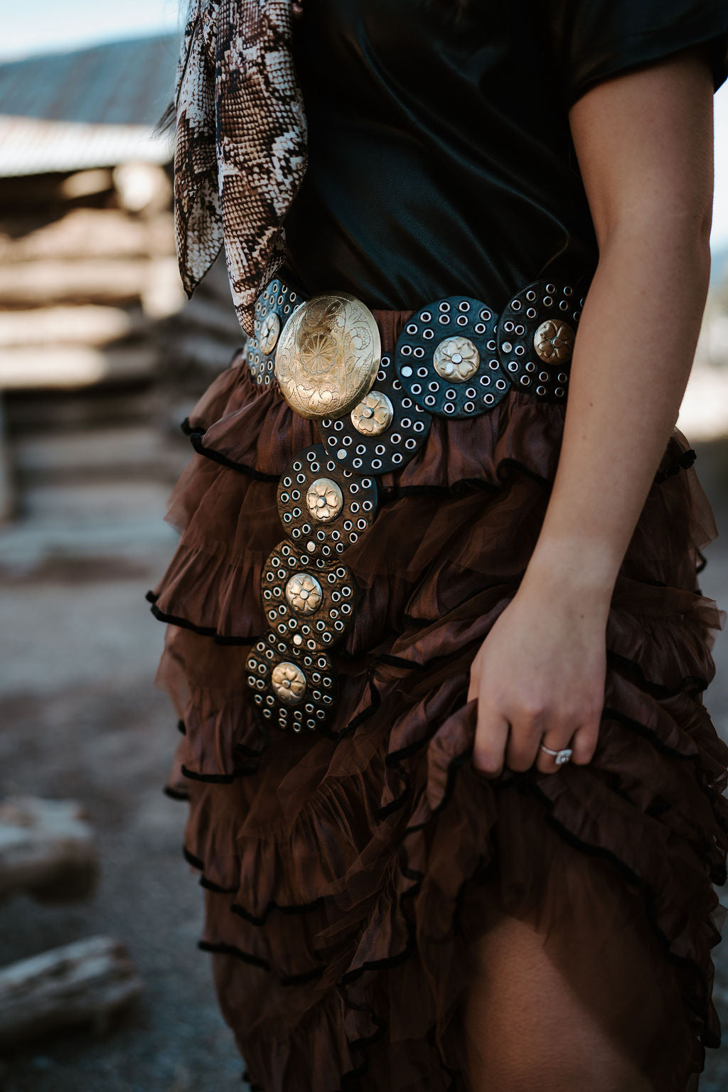 -Brown ruffle tulle skirt with velvet taped edge.